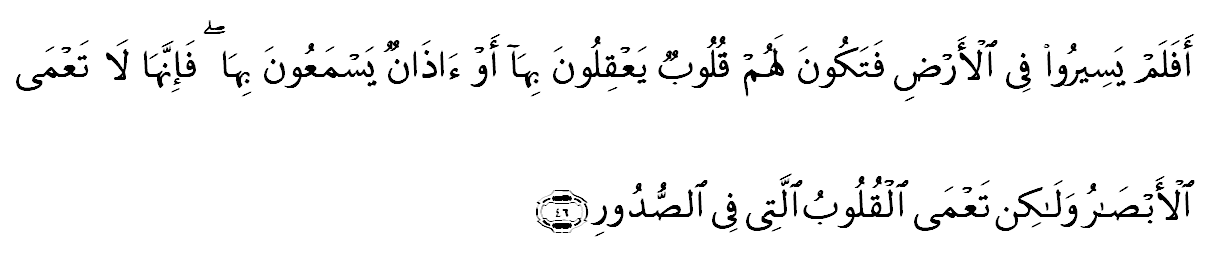 Artinya: “Maka Apakah mereka tidak berjalan di muka bumi, lalu mereka mempunyai hati yang dengan itu mereka dapat memahami atau mempunyai telinga yang dengan itu mereka dapat mendengar? karena Sesungguhnya bukanlah mata itu yang buta, tetapi yang buta, ialah hati yang di dalam dada.”Dalam ayat ini dijelaskan bahwa substansi yang mampu ber’aql adalah qalb. Ber-‘aql di sini berarti mempunyai kecerdasan sebagaimana dijelaskan Ibnu Zakariya (w.395 H/1004 M) bahwa semua kata yang terdiri dari huruf ‘ain, qaf, lam menunujukan kepada arti kemampuan mengendalikan sesuatu, baik berupa perkataan, pikiran, maupun perbuatan. Dari sini secara jelas menunjukan bahwa hati (qalb) adalah subtansi yang berperan mengendalikan jasmani dan rohani manusia.